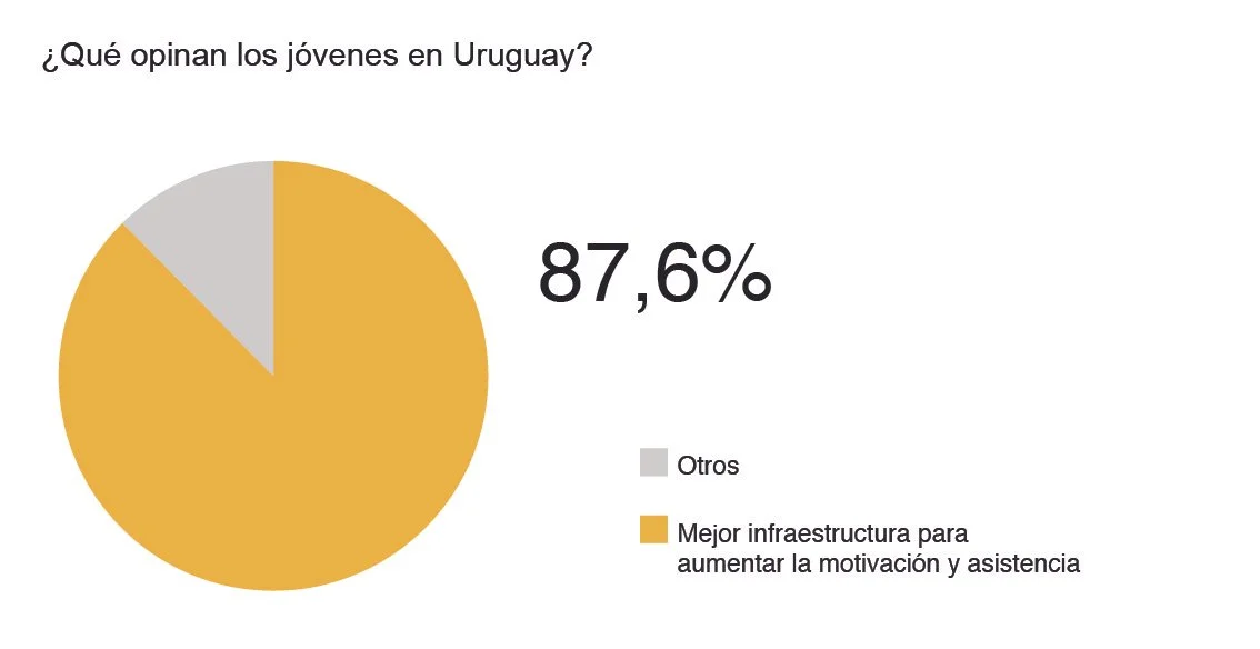 Sin irnos más lejos en Uruguay el 87,6% de los y las jóvenes opinan que es necesario contar con una mejor infraestructura para aumentar la motivación y la asistencia a un centro educativo.